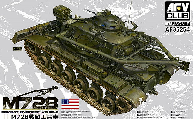 El Vehiculo de Ingeniero de Combate (CEV) M728 es un vehiculo que se utiliza para romper, remover obstaculos, transportar equipos de demolicion y operaciones de ingenieros de campo. La produccion comenzo en 1965 y ceso en 1987. Se produjeron un total de 312 de todas las variantes de estos vehiculos blindados para ingenieros. El M728 es un vehiculo diseñado para proporcionar la maxima proteccion balistica a la tripulacion y es un derivado altamente armado del tanque de la serie M60 modificado para proporcionar un arma movil y maniobrable para el apoyo de combate de las tropas y vehiculos terrestres. Se utiliza para desarticular, eliminar obstaculos y transportar equipos de demolicion. Aunque el M728 consiste en un casco de tanque y una torreta de barril corto, no es un tanque y no debe ser usado rutinariamente contra tanques enemigos. Es un excelente vehiculo de apoyo de asalto pesado cuando se usa como parte de un equipo combinado de ingenieros e infanteria. Por lo general, esta equipado con un conjunto de grua articulada y una placa bulldozer M9 operada hidraulicamente o un arado contra minas D7. Esta armado con un cañon de demolicion de barril corto M135 de 165 mm con 30 cartuchos de municion HEP (explosivo alto, plastico). El proposito principal del cañon es despejar accesorios y obstaculos defensivos, como muros, cercas, bloqueos de carreteras y refugios, o destruir edificios, y en general no esta destinado a usarse en la guerra antipersonal o antitanque. En este kit, AFV nos presenta un excelente kit para representar un M728. El terminado de fundicion de la torreta esta fielmente reproducido, incluyendo los numeros de moldes en la superficie asi como los rieles y asas. La escotilla del comandante y cargador pueden ser ensambladas abiertas o cerradas y se incluyen los visores transparentes de la misma, la cupula del comandante se suministra fabricada en plastico transparente para enmascarar los visores y pintar el resto de la misma. Tambien los visores de el conductor y el periscopio son proporcionados en partes transparentes. Se da la opcion de ensamblar el tanque con ruedas de aluminio o de acero, ya que se incluyen ambos juegos completos. Tambien se incluye la opcion de colocar la grua en posicion de operacion o bien, de transporte. La cubierta del motor esta suministrada en partes independientes por si se desea colocar en posicion abierta (aunque no se suministra el motor). La cubierta del mantelete y la manga del cañon estan suministrados en Vinil para poder reproducir de mejor manera el acabado de lona de los usados en el tanque original. El casco inferior esta moldeado en una sola pieza, y tambien reproducen el acabado de fundicion. Se incluyen cables de arrastre, faro de busqueda AN/VSS-1 con cable en vinil para simular la coneccion, las cajas de herramienta sobre las salpicaderas pueden ser abiertas o cerradas, suspension detallada. Cadenas continuas de vinil, hojas de fotocortados, cañon m135 torneado en aluminio con estriado interno y calcas para tres decoraciones: 7mo Batallon de Ingenieros, Ford Carson, Colorado, Abril 1967; 11vo Regimiento de Caballeria Blindada, Vietnam, 1969