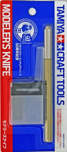 En septiembre de 2018, “Tamiya 1/35 Military Miniature Series” celebro su 50 aniversario. Medio siglo desde el lanzamiento del conjunto de soldados de tanques alemanes en septiembre de 1968. Para celebrar tan significativo evento, Tamiya presenta una herramienta edicion de aniversario con emblema acorde de una practica navaja en paquete de mango con navajas de remplazo incluidas. Este mango es muy resistente, asi como las navajas, para disminuir la posibilidad de rotura de las hojas cuando se aplica fuerte presion en el corte. Fabricado en color Amarillo Oscuro, para recordar los vehiculos Militares a escala. El mango mide de largo 5.5" (140mm) y cuenta con paquete de 25 navajas en un estuche de facil manejo, incluye capucha protectora.