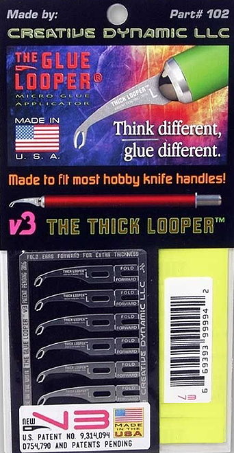 El 'Glue Looper' es una nueva herramienta para poder colocar la cantidad exacta de adhesivo en el lugar preciso. Por efecto de capilaridad, esta herramienta puede albergar una pequeña gota de pegamento liquido, como cemento para plastico o cianocrilato y no goteara o chorreara. La version 3 de The Glue Looper, tambien llamada The Thick Looper, fue diseñada para usarse con versiones mas densas, o viscosas, de pegamentos de cianoacrilato en mente. Para usarlo, una vez que se llena de pegamento la herramienta, arrastre el borde del Looper a traves del elemento sobre el que desea depositar el pegamento. Puede ser instalada en cualquier mango estandar que pueda sujetar una navaja No 11. y debe de ser utilizado en posicion vertical. El residuo de pegamento puede ser eliminado con la flama de un encendedor. Hoja con 6 aplicadores. Fabricado en USA en acero inoxidable.