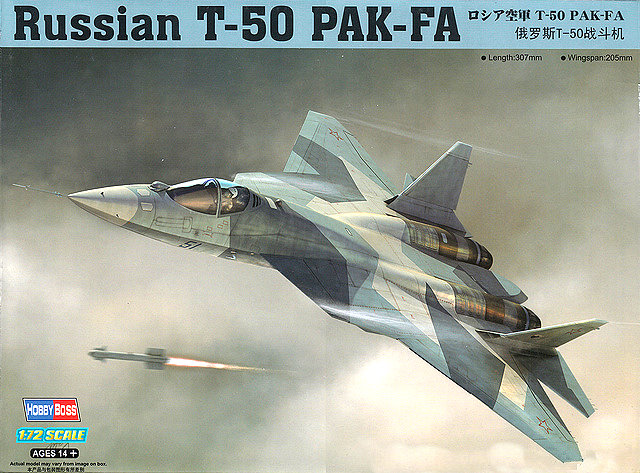 Perspektivnyi Aviatsionnyi Kompleks Frontovoi Aviatsyi, (caza tactico de primera linea). El PAK-FA (o T-50 designacion interna), incorporara la tecnologia experimental desarrollada en el proyecto Su-47 y del MiG 144 pero con nuevas alas de forma romboidal similares al F-22 Raptor. Podra transportar armas internas bajo la estructura central del avion, con capacidad para 5 misiles aire-aire de corto alcance, montados en un lanzador rotatorio opcional detras del asiento del piloto, entre las toberas de entrada de aire a los motores y otras variantes, tendran dos pilones de carga en cada ala, con 4 misiles aire-aire de largo alcance, para la intercepcion de objetivos lejanos a los lugares defendidos, en los combates a gran altitud fuera del rango visual del piloto, como el avion caza tactico de largo alcance MiG-31. Tendra el nuevo Radar Phazotron N 014, de gran potencia comparable al del MiG-31, para hacer desaparecer progresivamente la señal del Radar de control de fuego del avion adversario; en el cono trasero, tendra dos radares N 012 para reducir la marca de radar y dificultar, que lo iluminen los radares de aviones enemigos; a futuro contara con el nuevo sistema de vuelo furtivo de Plasma Stealth, desarrollado actualmente en forma experimental en Rusia. Hobbyboss presenta su totalmente nuevo T-50 en escala 1/72. El kit presenta toda la estructura superior en una sola pieza, por lo que la superficie continua y de suaves corvaturas, esta representada en un magnifico nivel. Asi mismo la parte inferior mantiene tambien la misma arquitectura, por lo que el kit conserva la silueta estilizada caracteristica de este avion. Los elevadores y timones estan moldeados de manera independiente, interior de cabina detallado, incluyendo el asiento eyector y cuenta con opciones de cabina transparente para elaborar la primera o segunda version. Tren de aterrizaje detallado e incluye hoja de fotocortados. Consta de 70 partes y mide ya armado 27.5cm por 19.5cm .