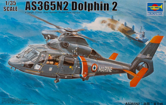 El AS365 Dauphin (‘delfin’ en frances) es un helicoptero bimotor medio polivalente diseñado y fabricado originalmente por la compañia francesa Aerospatiale, y desde 1992 por el Grupo Eurocopter, despues de la integracion de la primera en el grupo aeronautico europeo. Desarrollado a partir del helicoptero monomotor Aerospatiale SA 360 Dauphin, el Dauphin es uno de los diseños con mas exito de Eurocopter y es utilizado de un modo generalizado como transporte corporativo, helicoptero policiaco, helicoptero de noticias, evacuaciones medicas y helicoptero de busqueda y salvamento. Una de los distintivos mas caracteristicos de este helicoptero es el rotor de cola fenestron. Despues de la version original AS 365C, aparecio la version AS 365N. Esta es una version mejorada del SA 365C y disponia de dos motores Turbomeca Arriel 1C mas potentes y tren de aterrizaje retractil. Kit de Trumpeter que contiene un gran set de componentes. Las compuertas pueden ser ensambladas abiertas o cerradas, se incluye set de fotocortados para cabina. Contiene el rotor principal, transmision, radar de nariz asi como motores Arriel 1C detallados. Tanto el cono de nariz como las cubiertas de los motores pueden ser ensamblados en posiciion abiertos, para poder apreciar el interior una vez terminado. Calcas para una decoracion de la Fza Naval Francesa. Consta de 330 partes y mide ya ensamblado 372mm por 301mm.